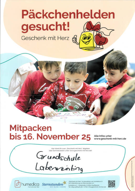 Wie jedes Jahr zur Weihnachtszeit beteiligen wir uns wieder an der bayernweiten Aktion „Geschenk mit Herz“ und sammeln Weihnachtspäckchen für Kinder in Not. Die Hilfsorganisation humedica e. V. (Kaufbeuren) bringt diese Päckchen zu Kindern aus acht Ländern in Südost- und Osteuropa. Auch in diesem Jahr sollen wieder zehntausende Päckchen in ganz Bayern gepackt werden. Ihr Päckchen können Sie gerne Montag bis Donnerstag von 7:30 Uhr bis 10:00 Uhr an der Schule abgeben. Schon heute sagen wir "Vergelt`s Gott" für Ihre Spende!